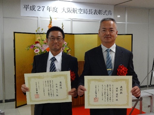 平成27年度大阪航空局長表彰式典に於いて 当社社員 今井隆人が永年にわたって業務支援を続け、他の模範として、 また濱田暢宏が整備士として運航事業に従事し、 安全運航に努めた功績が称えられ、大阪航空局長より表彰されました。