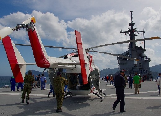 訓練では、当社のヘリも仮想ドクターヘリとして参加し、海上自衛隊輸送艦「しもきた」へ模擬患者の搬送を行いました。