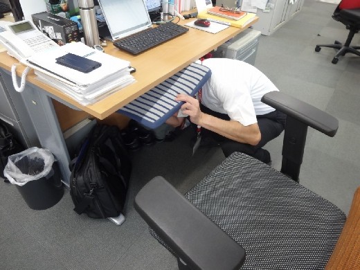 9/1(火)、名古屋本社でシェイクアウト訓練を行い、地震発生の訓練アナウンスとともに、各々机の下に隠れて身を守る動作をとりました。
