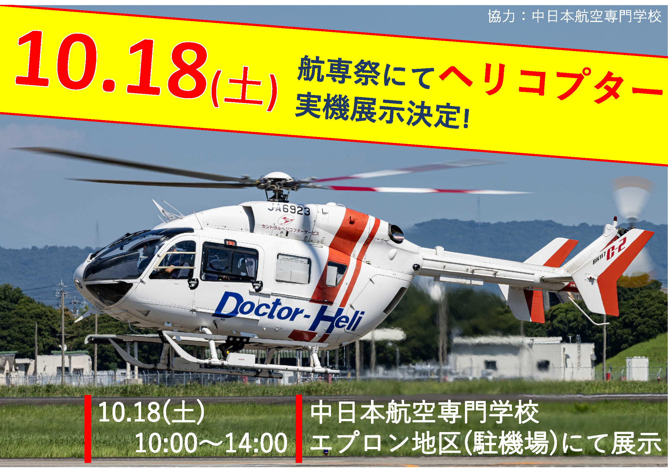 当社が所有する BK117C-2(JA6923)型機 を、10月18日(土)に開催される 中日本航空専門学校「航専祭」 にて展示させて頂くことになりました。