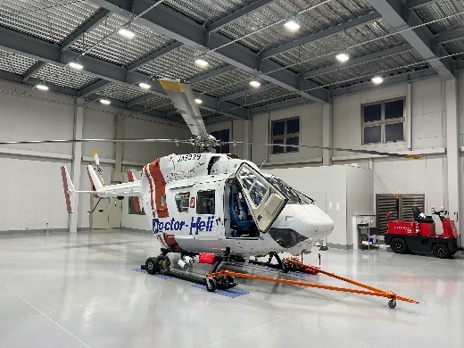 弊社が運航を受託している岡山県ドクターヘリには、これまで格納庫がなく、機体が風雨にさらされていることにより不具合が発生することがありました。また、荒天時には岡南飛行場等へ退避する必要もありました。