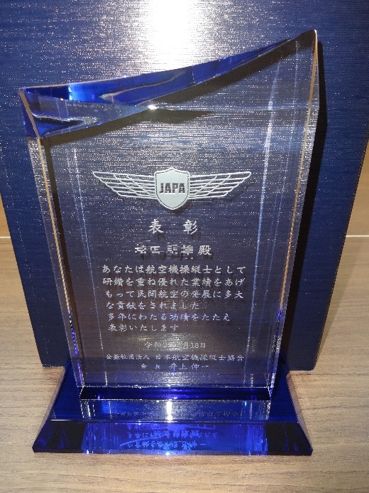 当社社員が永年にわたって操縦士として運航事業に従事し、安全運航に努めた功績が称えられ、日本航空機操縦士協会より表彰されました。